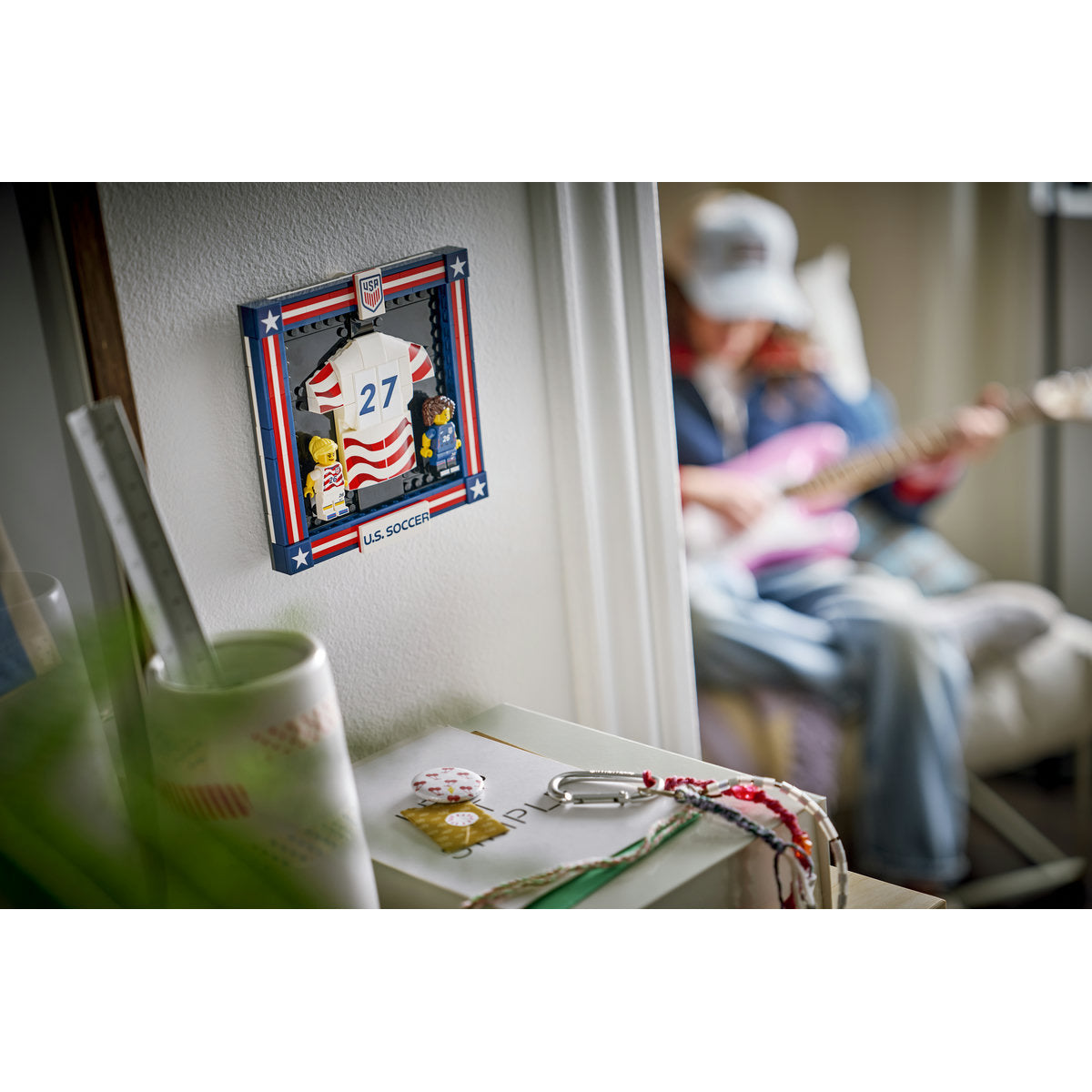 A gyerekek élvezettel készítik el az amerikai labdarúgócsapat mezének keretezett változatát, miközben felfedezik az összes érdekes részletet. A készlet számos nyomtatott elemet és egy nagy matricát is tartalmaz, amelyen számok találhatók, így a gyerekek 0 és 99 közötti számmal díszíthetik a LEGO focimezt. A szett ezenkívül tartalmaz 2 LEGO focista minifigurát is: az egyik a csapat csíkos, a másik pedig a csillagos mezét viseli. Mindkét figura cserélhető fej- és hajelemekkel rendelkezik, hogy kedvedre testre szabhasd. Miután elkészült, a készlet büszkén kiállítható futballdekorációvá válik.