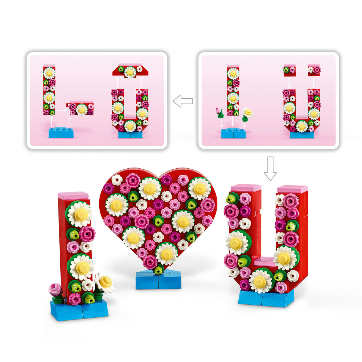 A kreatív Valentin-napi tevékenységeket kedvelő gyerekek megépíthetik a „LOVE” szót, amelyben a „V” betű egy megépíthető szívet ábrázol. Vagy átépíthetik a betűket úgy, hogy az „I »szív« U” (Szeretlek) szöveget kapják. Ezután a virágos kiegészítőkkel személyre szabhatják a feliratot. A betűk rózsaszín és piros színekben pompáznak, így csodásan feldobják az otthonodat, bárhol is állítod ki.