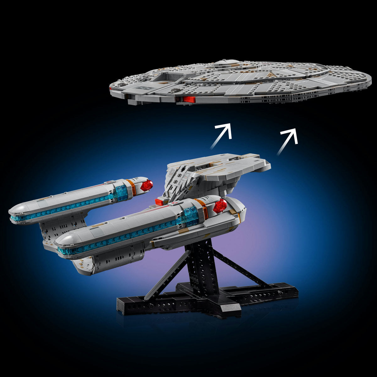 • Csodálatos sci-fi-dekoráció – A szett része egy döntött, az U.S.S. Enterprise modell adattáblájával ellátott bemutatóállvány, és egy Star Trek: The Next Generation feliratú minifigura-állvány