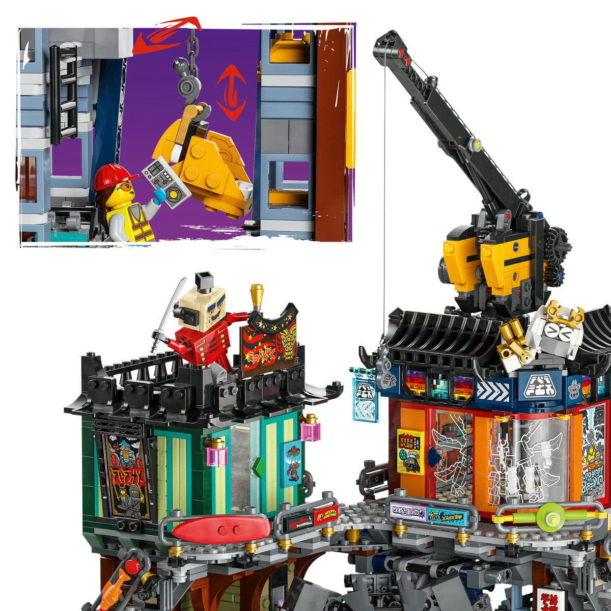 Add LEGO® NINJAGO® City modellgyűjteményedhez ezt a csodálatosan részletgazdag, négyemeletes NINJAGO® City műhelyek játékkészletet! Tele van olyan vagány részletekkel, mint a levehető apartmanok, üzletek, éttermek, a 2 működő daru, és most először egy olyan beállítható játék robot, amelyet páncéllal és matricákkal szabhatsz testre. A jó és a gonosz közt dúló csatákat a 10 minifigura kelti életre.